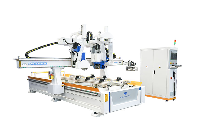 藍象多功能家具數控門加工中心是一款專門用于門邊切割、鉸鏈孔鉆孔、門鎖孔鉆孔的全自動木門加工機,集傳統門鉸鏈孔機和四面切割鋸機功能于一體,大大提高了加工效率。 1、兩把鋸片均可90°旋轉,完成木門方邊加工;